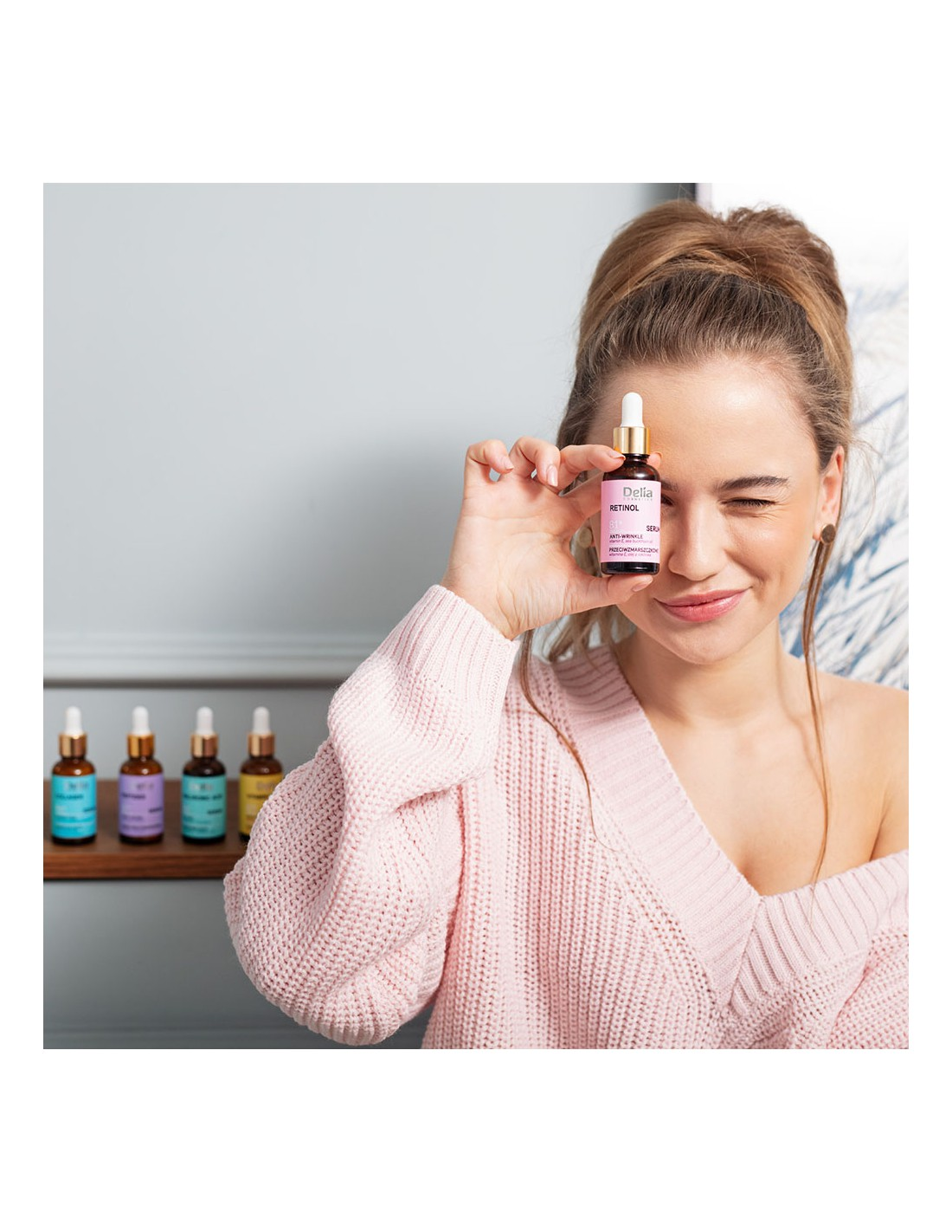 The serum is an intensely cocentrated formula with a higher concentration of active ingredients than in an average face cream. Serum with retinol reduces the visibility of wrinkles, noticeably strengthens the skin, provides a feeling of nourishment, supports regeneration and gives the skin a youthful appearance.